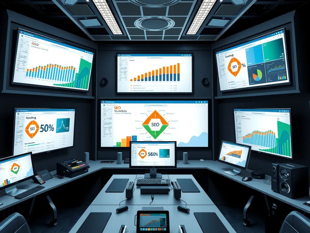 أتمتة السيو التقني: استعادة مئات الساعات المفقودةAutomated SEO tools and bots working in unison, digital representation of SEO automation with connected nodes and algorithms